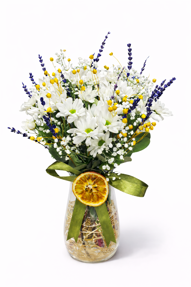 Bu özel tasarım aranjman; beyaz papatyaların saf ve temiz enerjisini, lavantanın rahatlatıcı etkisini ve portakalın Akdeniz ferahlığını bir araya getirir.Çiçeklerin arasına ve ön yüzüne özenle yerleştirilen doğal portakal dilimi, tasarıma hem görsel hem de duygusal olarak farklılık katar.Şeffaf cam vazoda hazırlanan aranjman, doğal saman dolgu ve yeşil kurdele detayıyla tamamlanmıştır. Sarı billy button (craspedia), cipso (gypsophila) ve lavanta dalları sayesinde aranjman son derece dolgun, canlı ve butik bir görünüm sunar.Sıradan çiçeklerden sıkılanlar için farklı, doğal ve çok özel bir hediye alternatifidir.Florenta Çiçekçilik kalitesiyle taze çiçek garantisi ile hazırlanır. ?? ÜRÜN DETAYLARIAna Çiçek: Beyaz Papatya ( 25 adet )Ek Çiçekler: Lavanta, Sarı Craspedia (Billy Button)Dolgu: Cipso (Gypsophila)Aksesuar: Doğal portakal dilimiVazo: Şeffaf cam vazoBağlama: Yeşil saten kurdele ?? BAKIM ÖNERİSİVazodaki su 2 günde bir değiştirilmelidirSaplar hafif çapraz kesilmelidirSerin ve aydınlık ortamda muhafaza edilmelidirPortakal dekor amaçlıdır, suya temas ettirilmemelidir