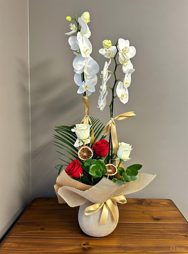 Zarafet ve ihtişamın aynı tasarımda buluştuğu bu özel aranjman, seçkin zevkler için hazırlandı. Canlı çift dal beyaz Phalaenopsis orkide, kırmızı ve beyaz güllerle harmanlanarak güçlü ve dengeli bir kompozisyon oluşturur.Doğal yeşil yapraklar, kurutulmuş portakal dilimleri ve özel saksı kaplamasıyla tasarım; hem modern hem de sıcak bir atmosfer sunar. Altın tonlu kurdele detayları, aranjmana lüks bir dokunuş katar.Yeni iş tebriği, terfi, özel günler, yıldönümü veya prestijli bir hediye arayanlar için mükemmel bir tercihtir. Uzun süre kalıcılığı sayesinde bulunduğu ortamda haftalarca şıklığını korur ve güçlü bir izlenim bırakır.(Canlı ürün olduğu için ölçülerde küçük farklılıklar olabilir.) ?? Ürün İçeriğiCanlı Çift Dal Beyaz Phalaenopsis Orkide2 adet Kırmızı Gül2 adet Beyaz GülDekoratif yeşil yapraklar2 adet Kurutulmuş portakal dilimleriÖzel dokulu saksı ve doğal ambalajAltın renkli kurdeleEl yapımı florist tasarımı ?? Bakım BilgileriOrkide için haftada 1 kez, kök kontrolü yapılarak sulamaGüller tazeliğini koruyacak şekilde düzenlenmiştirDirekt güneş ışığından uzak, aydınlık ortam tercih edilmelidirAşırı sıcak ve cereyandan korunmalıdır