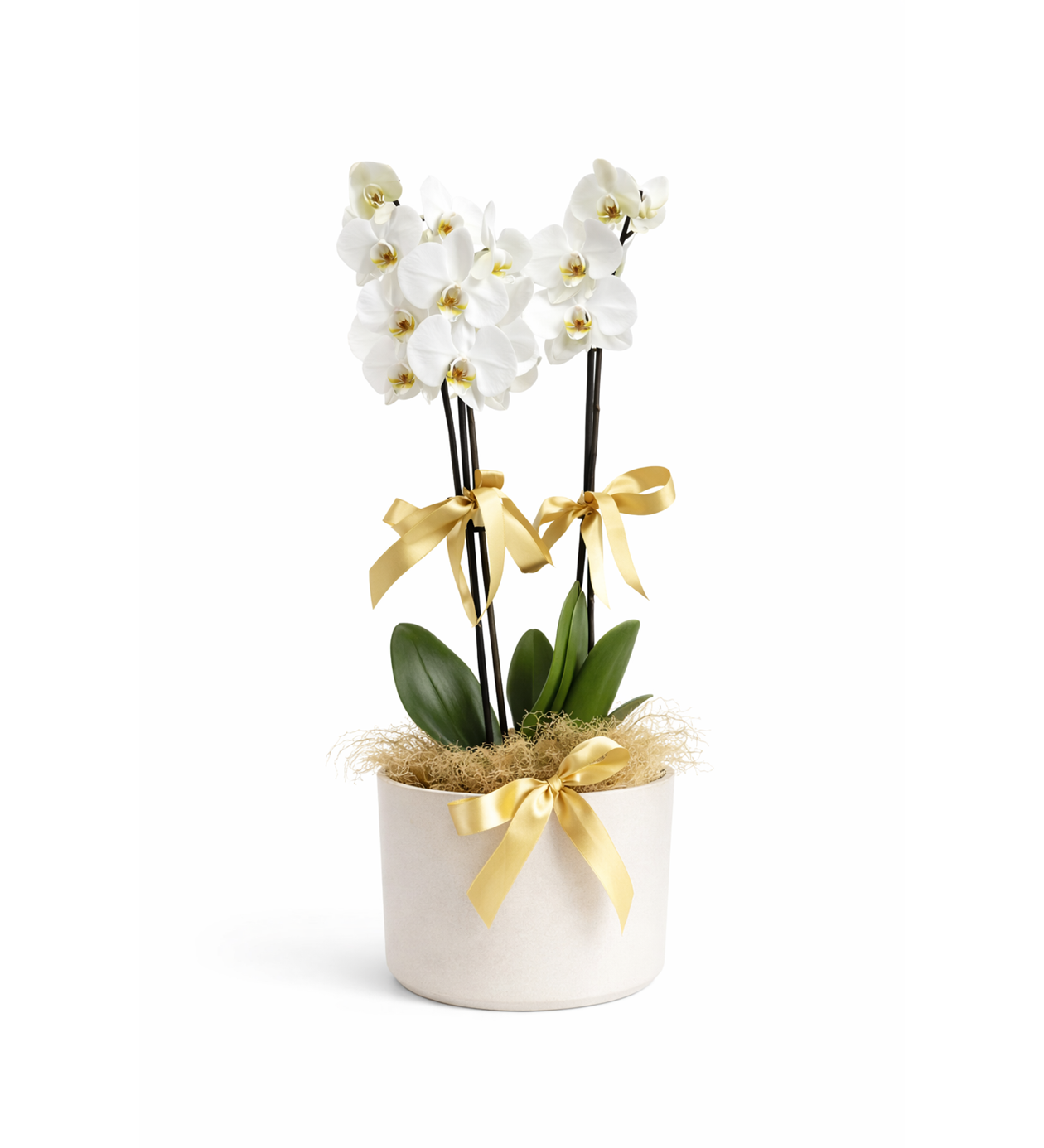 Beyaz orkide; zarafeti, saflığı ve kalıcı şıklığı simgeler. Bu özel çift dallı beyaz orkide, gold kurdele ve doğal dokulu süslemelerle zenginleştirilerek hem klasik hem modern bir tasarım anlayışıyla hazırlanmıştır.İki dal üzerinde açan dolgun ve sağlıklı orkide çiçekleri, mekâna ferah ve sofistike bir hava katar. Gold kurdele detayları ve natürel süsleme, ürüne lüks bir görünüm kazandırırken; sade renk paleti sayesinde her ortama kusursuz uyum sağlar.Uzun ömürlü yapısı sayesinde sadece bir hediye değil, aynı zamanda kalıcı bir dekoratif parça olarak da tercih edilir.?? Beyaz Phalaenopsis Orkide (Çift Dal)