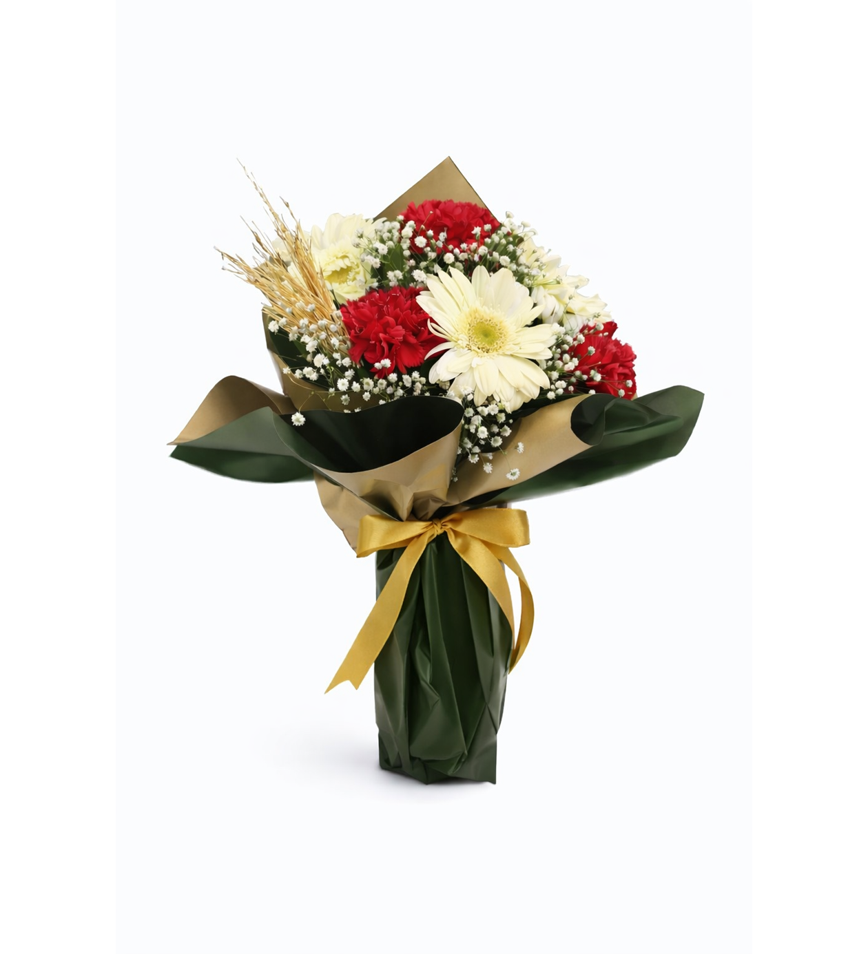 Yeşil ve gold tonlarında özel ambalaj ile hazırlanan bu buket; beyaz gerberanın sade zarafetini, kırmızı karanfillerin güçlü duruşu ve cipsonun zarif dokusuyla bir araya getirir. Doğal başak detayları bukete farklı ve asil bir karakter kazandırır.Kırmızı ve beyaz renk uyumu; saygı, samimiyet ve içtenliği simgeler.Özellikle tebrik, geçmiş olsun, teşekkür ve resmi ziyaretler için sık tercih edilen şık bir alternatiftir.Tüm buketler günlük taze çiçeklerle hazırlanır.?? ÜRÜN DETAYLARIÇiçek Türleri:Beyaz Gerbera 3 adetKırmızı Karanfil 3 adet