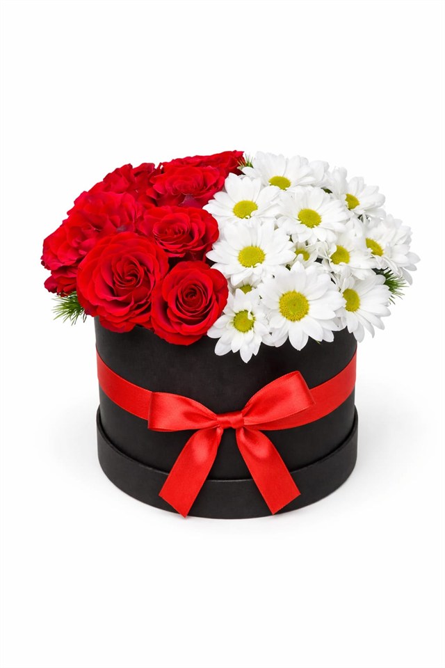 Bu özel flower box tasarımı; kırmızı güllerin tutkusunu ve beyaz papatyaların saf duygularını aynı kutuda bir araya getirir. Yarım–yarım yerleşim, hem görsel olarak çarpıcı hem de anlam olarak güçlü bir denge sunar.Mat siyah silindir kutu, çiçeklerin renklerini ön plana çıkarırken kırmızı saten kurdele detayı tasarıma romantik bir dokunuş katar. Bu aranjman, klasik çiçek modellerinden ayrılarak anlamı olan, hikâyeli bir hediye arayanlar için tasarlanmıştır.Sevgiliye, eşe, yıl dönümüne ya da özel bir barışma anına yakışan bu ürün,Florenta Çiçekçilik kalitesiyle taze çiçek garantisi ve özenli el işçiliğiyle hazırlanır. ???? ÜRÜN DETAYLARIÇiçek Türleri:Kırmızı GülBeyaz Papatya (Kasımpatı )Yerleşim: Yarım kırmızı gül – yarım beyaz papatyaAdet:Gül: 12 adetPapatya: 20 taneKutu: Siyah silindir boxBağlama: Kırmızı saten kurdele ?? BAKIM ÖNERİSİKutudaki sünger nemli tutulmalıdırDirekt güneş ışığından uzak tutulmalıdırSerin ortamda muhafaza edilmelidirÇiçek besini kullanılması tavsiye edilir