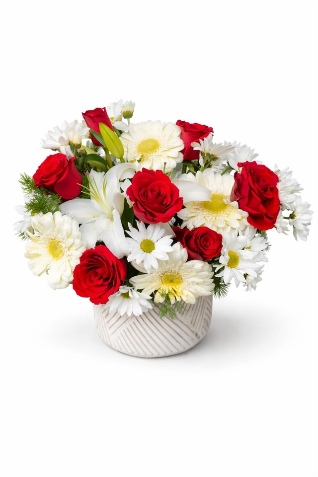 Kırmızı güllerin güçlü ve romantik duruşu, beyaz papatyaların sade zarafeti ve beyaz lilyumların asil dokunuşuyla hazırlanan bu özel aranjman; duygularınızı en şık şekilde ifade etmeniz için tasarlandı.Seramik saksı içerisinde, dengeli ve dolgun bir formda hazırlanan aranjman;hem klasik hem modern tarzı bir arada sunar.Özel günlerde, sevdiğinize anlamlı bir sürpriz yapmak veya bulunduğu ortama zarif bir dokunuş katmak isteyenler için ideal bir tercihtir.Florenta Çiçekçilik’te siparişe özel, günlük taze çiçekler kullanılarak hazırlanır. ?? ÇİÇEK İÇERİĞİKırmızı Gül 7 ADETBeyaz Papatya 15 ADETBeyaz Lilyum 5 ADET (Açık & Tomurcuk)Beyaz Gerbera 5 adetCipsoMevsim yeşillikleri ?? BAKIM ÖNERİLERİSaksı içi toprak/sünger hafif nemli tutulmalıdırDirekt güneş ışığından ve rüzgârdan uzak tutulmalıdırSerin ortamda daha uzun süre canlı kalırLilyumlar açtıkça aranjman daha gösterişli hale gelir