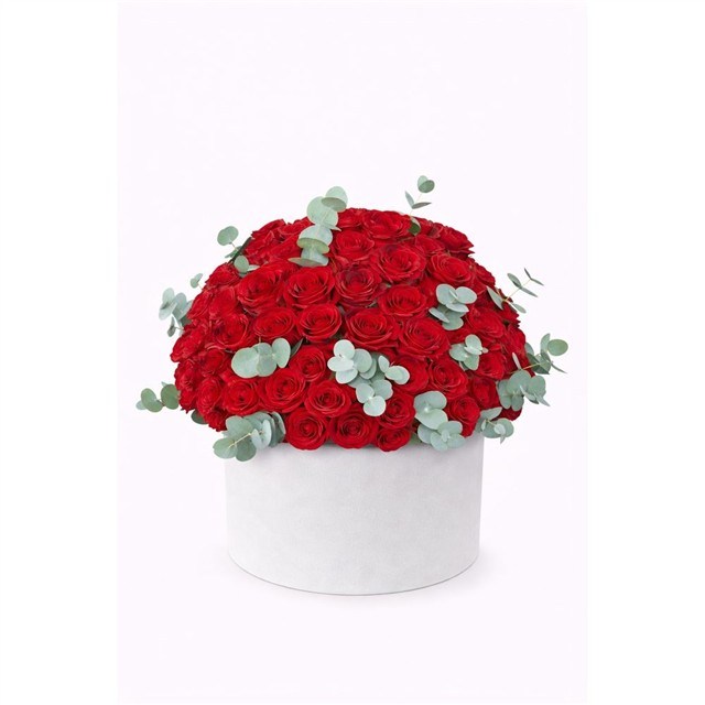 Canlı ve taze kırmızı güllerle hazırlanan bu özel tasarım, yoğunluğu ve kusursuz dizilimiyle gerçek bir premium gül aranjmanıdır.Beyaz silindir kutu içerisinde tam dolu şekilde hazırlanan kırmızı güller, okaliptus yapraklarıyla zarif bir denge kazanır. Aşkı, tutkuyu ve güçlü duyguları anlatmak isteyenler için etkileyici bir tercihtir. ?? ÜRÜN DETAYLARIÇiçek Türü: Kırmızı gülGül Sayısı: 100 adetYeşillik: OkaliptusKutu: Beyaz, silindir, premium