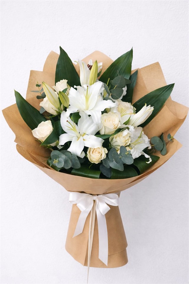Beyaz lilyumların asil duruşu ve beyaz güllerinzamansız şıklığı ile hazırlanan bu özel buket,sadeliği sevenler için kusursuz bir tercihtir.Doğal okaliptüs ve cipso dokunuşlarıyla zenginleştirilenaranjman, şık krem tonlarındaki ambalajı ileher ortama uyum sağlar.Düğün, nişan, yeni iş tebriği, teşekkür,geçmiş olsun ve anlamlı günler içinzarif ve prestijli bir hediye seçeneğidir.Tüm buketlerimiz günlük taze çiçeklerleel yapımı olarak hazırlanır.ADET : 3 DAL BEYAZ LİLYUM 10 DAL BEYAZ GÜL