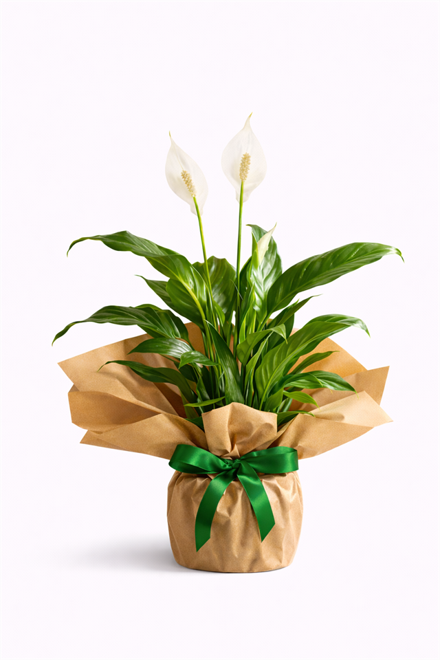 Barış çiçeği (Spathiphyllum), bulunduğu ortama pozitif enerji, huzur ve ferahlık katan özel bir iç mekân bitkisidir. Parlak yeşil yaprakları ve saf beyaz çiçekleriyle hem modern hem de zamansız bir görünüm sunar.Bu tasarımda barış çiçeği, doğal kraft kâğıt ambalaj ve yeşil saten kurdele ile tamamlanarak sade, şık ve doğaya yakın bir stil kazanmıştır. Ev, ofis ve çalışma alanları için uzun ömürlü ve anlamlı bir hediye alternatifidir.Florenta Çiçekçilik güvencesiyle, canlı ve bakımlı şekilde hazırlanır. ?? ÜRÜN DETAYLARIBitki Türü: Barış Çiçeği (Spathiphyllum)Çiçek Rengi: BeyazAmbalaj: Kraft kâğıtKurdele: Yeşil satenYaklaşık Yükseklik: 40–55 cmKullanım Alanı: İç mekân ?? BAKIM TALİMATLARIToprak hafif nemli kalacak şekilde haftada 1–2 kez sulayınızDirekt güneş ışığından kaçınınAydınlık ama dolaylı ışık alan ortamları severYapraklar nemli bezle silinebilirAyda 1 kez bitki besini uygulanabilir