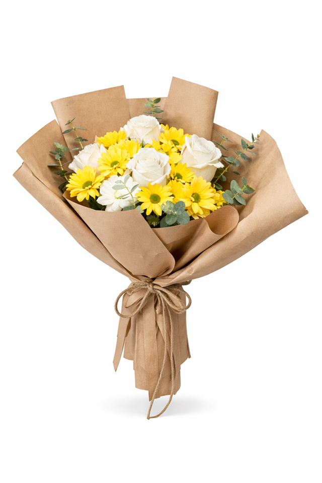 Beyaz güllerin sade şıklığı ve sarı papatyaların canlı enerjisiyle hazırlanan bu özel buket,taze çiçekler kullanılarak özenle tasarlanmıştır. Kraft ambalajı ve doğal bağlama detayı,sıcak, samimi ve ferah bir görünüm sunar.Mutluluk, teşekkür ve içten dilekleri ifade etmek için ideal olan bu buket;doğum günü, geçmiş olsun, yeni iş tebriği veya içten bir sürpriz için mükemmel bir tercihtir.Özenli paketleme ve aynı gün teslimat avantajıyla Florenta Çiçekçilik kalitesiyleadresine ulaştırılır.ADET : 5 ADET BEYAZ GÜL 30 ADET SARI PAPATYA
