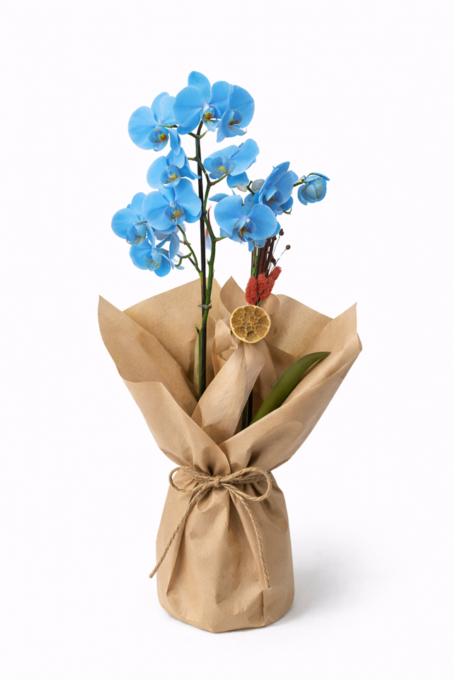 Mavi Phalaenopsis orkide; dinginliği, güveni ve zarif bir duruşu temsil eder. Çift dallı formu sayesinde sade ama güçlü bir etki bırakır. Doğal kraft ambalaj, jüt ip ve kuru portakal detayıyla tamamlanan bu tasarım; modern, net ve rafine bir hediye arayanlar için özenle hazırlanmıştır.Fazla gösterişten uzak ama bakıldığında fark edilen bir orkide tercih edenler için ideal bir seçimdir.(Canlı çiçek olduğu için dal sayısı ve çiçek yoğunluğu küçük farklılıklar gösterebilir.) ?? Ürün İçeriğiÇift dallı mavi Phalaenopsis orkideCanlı ve taze orkide çiçekleriSağlıklı yeşil yapraklarDoğal kraft kağıt ambalajJüt ip bağlamaKuru portakal & doğal kuru çiçek aksesuarları ?? Bakım BilgileriHaftada 1 kez az miktarda sulama yeterlidirAydınlık fakat direkt güneş almayan ortam tercih edilmelidirÇiçeklerin üzerine su temasından kaçınılmalıdırDoğru bakım ile uzun süre çiçekli kalır