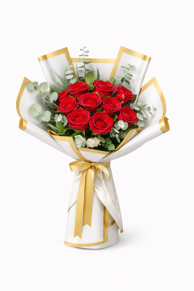 Kırmızı güllerin güçlü ve tutkulu duruşu,okaliptüs yeşillikleri ve altın detaylı özel ambalaj ilebir araya gelerek bu premium buketi oluşturur.Taze çiçekler kullanılarak özenle hazırlanan bu şık tasarım;sevgililer günü, yıldönümü, doğum günü, evlilik teklifive romantik sürprizler için mükemmel bir tercihtir.Florenta Çiçekçilik kalitesiyle hazırlanan bu özel buket,özenli paketleme ve aynı gün teslimat avantajıylasevdiklerinize güvenle ulaştırılır.ADET : 11 ADET KIRMIZI GÜL