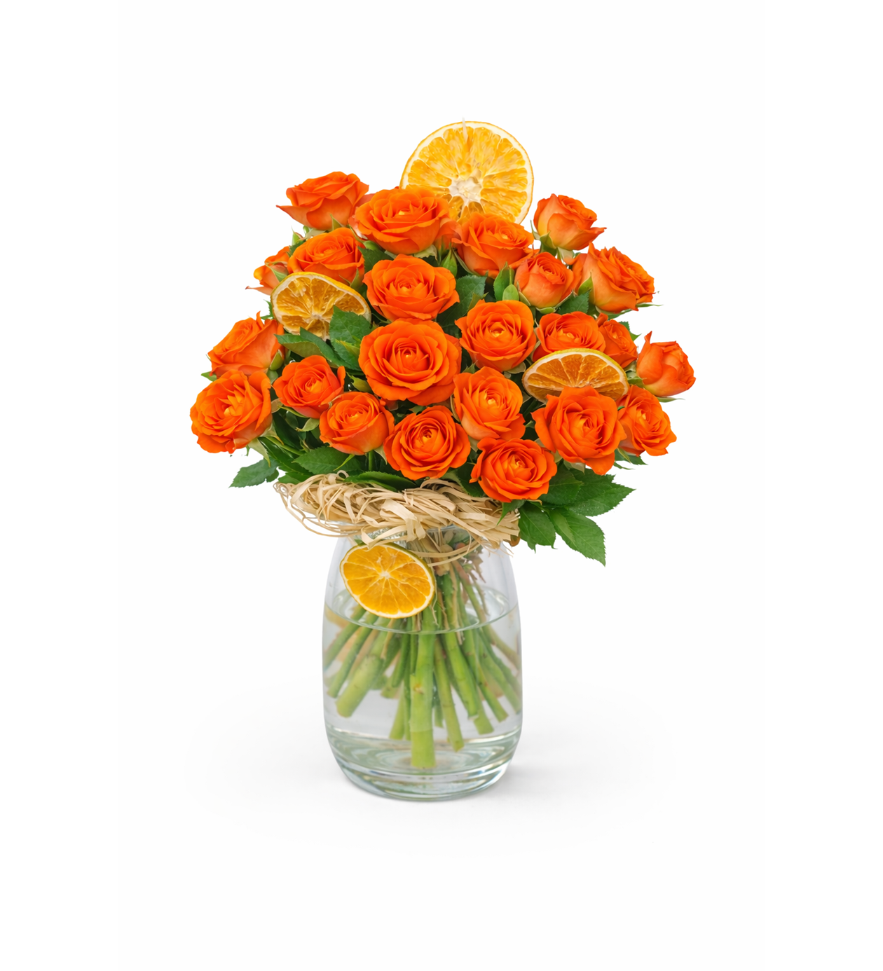 Yoğun ve dolgun yapısıyla öne çıkan turuncu çardak güller, bu aranjmanın ana yıldızıdır. Çok sayıda küçük gül başı sayesinde hacimli ve gösterişli bir görünüm sunar. Kurutulmuş portakal dilimleri aranjmana ferah ve doğal bir karakter katarken, şeffaf cam vazo modern bir şıklık sağlar. Doğum günü, yeni başlangıçlar ve motivasyon hediyeleri için çok enerjik ve dikkat çekici bir tercihtir.?? Ürün İçeriğiTuruncu çardak gül (28 adet )Canlı yeşil yapraklarKurutulmuş portakal dilimleri