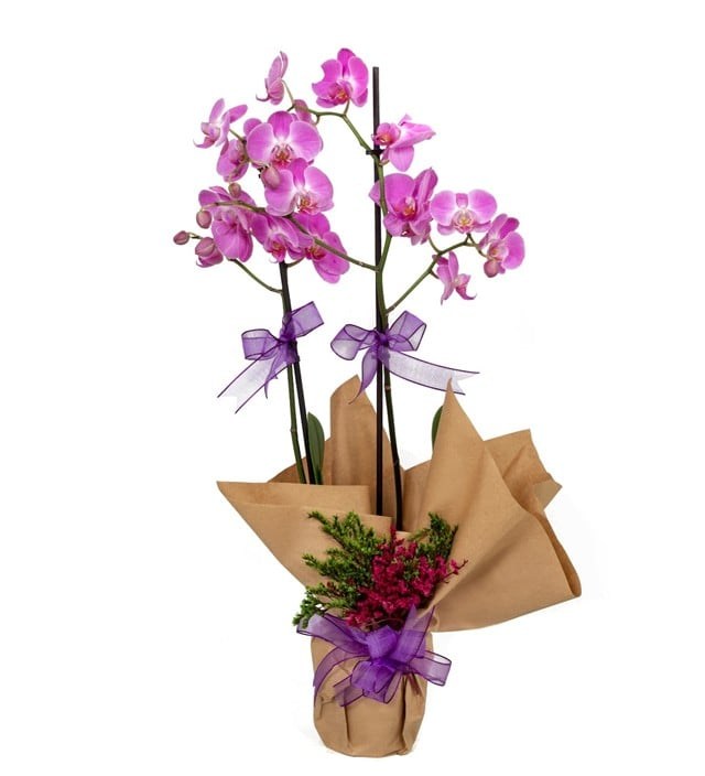 Kalbime Dokunan Orkide, mor Phalaenopsis orkidenin romantik enerjisini doğal kraft ambalajın sıcak dokusuyla buluşturur. Çift dallı yapısı sayesinde daha dolgun ve gösterişli bir görünüm sunarken, mor tül kurdele detayları tasarıma zarif bir şıklık katar. Sevgiliye, eşe ya da özel bir anı ölümsüzleştirmek isteyenler için ideal bir seçimdir. Uzun ömürlü yapısıyla bulunduğu ortamda haftalarca canlılığını korur ve her bakışta duyguları tazeler. ?? ÜRÜN İÇERİĞİCanlı Mor Phalaenopsis Orkide2 dal orkide (çiçekli & tomurcuklu)Canlı yeşil orkide yapraklarıDekoratif saksıBeyaz ambalaj kaplamaMor tül kurdelelerDoğal kuru çiçek & yeşil dekorlar Canlı çiçek olduğu için çiçek yoğunluğu ve tonlarda küçük farklılıklar olabilir. ?? ORKİDE BAKIM TALİMATLARIDirekt güneş almayan aydınlık ortamHaftada 1 kez az miktarda sulamaSaksı altında su birikmesine izin vermeyinKlima ve kaloriferden uzak tutun