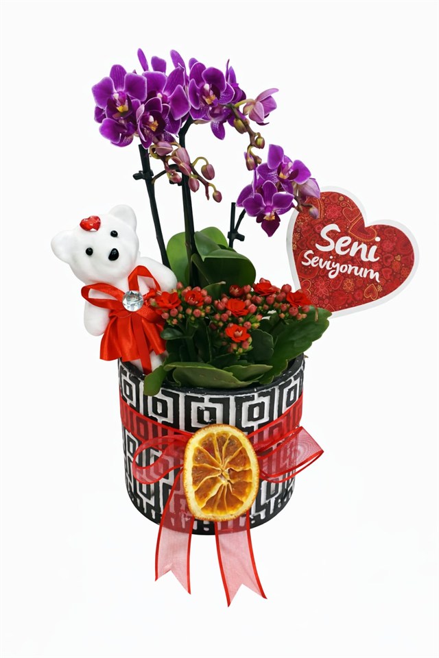 Sevginizi en tatlı ve en zarif şekilde ifade etmek için hazırlanan Mor Orkide & Ayıcık Kutusu, Florenta Çiçekçilik’in en özel romantik tasarımlarından biridir. Çift dallı mor orkidenin göz alıcı güzelliği, kırmızı kalanşo çiçeğinin canlı enerjisiyle birleşerek ortaya hem şık hem de duygusal bir aranjman çıkarır.Üründe bulunan “Seni Seviyorum” yazılı kalp aksesuarı ve sevimli peluş ayıcık, hediyenize anlam katar ve karşı tarafın yüzünde unutulmaz bir gülümseme bırakır. Kutunun üzerindeki kırmızı kurdele detayı ve dekoratif portakal dokunuşu ise ürünü daha da gösterişli hale getirir.Bu tasarım özellikle Sevgililer Günü, yıldönümü, doğum günü, özel sürprizler ve romantik hediyeler için mükemmel bir seçenektir. Orkide uzun ömürlü bir çiçek olduğu için hediye alan kişi günlerce bu güzel sürprizi hatırlamaya devam eder.Florenta Çiçekçilik tarafından özenle hazırlanan bu ürün, taze ve sağlıklı bitkilerle hazırlanır ve teslimat sırasında formu bozulmadan güvenli şekilde taşınır. ?? Ürün İçeriği Çift dallı Mini Mor Orkide (Phalaenopsis)Kırmızı Kalanjo (Kalanchoe)Seni Seviyorum yazılı kalp aksesuarBeyaz ayıcıkDekoratif kare vazoKırmızı kurdele süslemePortakal dilimi dekor ?? Orkide çiçek sayısı mevsime göre değişebilir. ?? Bakım Önerisi Orkideyi haftada 1 kez az suyla sulayınız.Direkt güneş ışığı yerine aydınlık ortamda tutunuz.Kalanjo çiçeği toprağı kurudukça sulanmalıdır.Aşırı sulama çiçeğe zarar verebilir.
