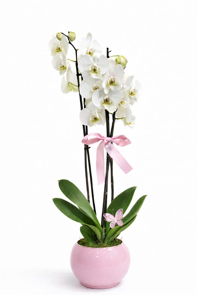 Saflığın ve zarafetin simgesi olan beyaz orkide, pembe tonların romantik dokunuşu ile buluştu…Kelebek Detaylı Pembe Saksıda Beyaz Orkide Tasarımı, hem modern hem de duygusal bir hediye arayanlar için hazırlanmış özel bir aranjmandır.Beyaz Phalaenopsis orkidenin asil duruşu, pembe seramik saksının şık görüntüsüyle birleşerek bulunduğu ortamda dikkat çeken bir dekoratif şıklık oluşturur. Üzerindeki pembe kurdele ve kelebek figürü ise ürüne romantik ve masalsı bir hava kazandırır.Bu tasarım; doğum günü, yeni iş tebriği, anneler günü, kadınlar günü, geçmiş olsun veya “seni düşünüyorum” demek istediğiniz her an için harika bir tercihtir. Hem ev dekorasyonunda hem de ofis ortamında uzun süre canlılığını koruyarak kalıcı bir mutluluk hissi yaratır. ? Ürün İçeriği (Detaylı)2 Dal Beyaz Phalaenopsis OrkidePembe seramik saksıPembe kurdele süslemeDekoratif kelebek figürüDoğal yosun zemin süslemesi ? Bakım Bilgisi (Detaylı)Orkidenizi direkt güneş ışığı almayan aydınlık bir ortamda bulundurunuz.Haftada 1 kez az miktarda sulama yeterlidir.Saksı içinde su birikmemesine dikkat ediniz.Sulama sırasında çiçeklere ve yapraklara su değdirmemek daha sağlıklı olacaktır.Orkide çiçekleri döküldükten sonra doğru bakım ile tekrar çiçek açabilir.Klima ve kaloriferden uzak tutulması tavsiye edilir.Ideal ortam sıcaklığı 18°C – 25°C aralığıdır.
