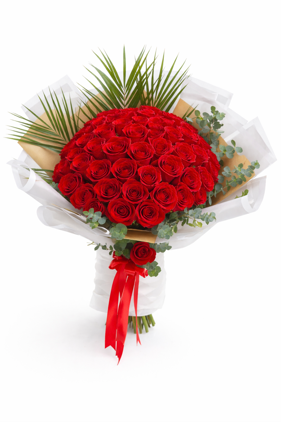 Kırmızı Tutku Gül Buketi, kırmızı güllerin güçlü aşk mesajını, hacimli ve gösterişli bir buket formunda sunar.Okaliptüs ve palmiye yaprakları bukete modern bir dokunuş katarken, kırmızı saten kurdele tasarımı tamamlar.Aşkı, tutkuyu ve derin duyguları en net şekilde ifade etmek isteyenler için hazırlanmış premium bir gül buketidir. ?? ÜRÜN İÇERİĞİ (ZENGİN) 50 adet taze kırmızı gülCanlı okaliptüs dallarıDekoratif palmiye yapraklarıŞık beyaz & kraft buket kâğıdıKırmızı saten kurdeleProfesyonel buket bağlama ?? BAKIM ÖNERİSİ Sapları çapraz keserek temiz suya koyunuzSuyu 2 günde bir değiştirinizDirekt güneş ve cereyandan uzak tutunuzSerin ortamda muhafaza ediniz