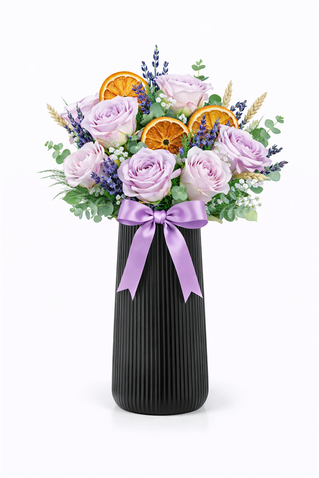 Lavanta Esintisi; lila güllerin romantik zarafetini, modern siyah seramik vazonun asil duruşu ile bir araya getiren özel bir tasarımdır. Günlük taze lila güller; lavanta dalları, okaliptüs yeşillikleri ve dekoratif kuru portakal dilimleriyle zenginleştirilerek hem görsel hem de duygusal açıdan etkileyici bir aranjman oluşturur.Siyah vazonun güçlü duruşu, lila tonlarının yumuşak romantizmiyle dengelenir. Bu özel tasarım; doğum günü, yıldönümü, özel günler, teşekkür veya şık bir jest arayanlar için mükemmel bir tercihtir. Tüm çiçekler özenle hazırlanır ve taze çiçek garantisi ile teslim edilir.ADET : 7 ADET LİLA GÜL 1 ADET SİYAH PLASTİK VAZO 3 ADET PORTAKAL