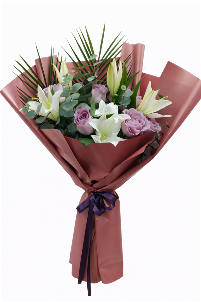 Şıklığı ve zarafeti bir araya getiren bu özel tasarım buket; lila güller, beyaz lilyumlar ve okaliptüs yapraklarıyla hazırlanarak modern ve premium bir görünüm sunar. Buketin içerisine eklenen palmiye yaprakları sayesinde daha dolgun, gösterişli ve dikkat çekici bir konsept elde edilmiştir.Lila güller romantizmi, zarafeti ve hayranlığı simgelerken; beyaz lilyumlar saflık ve asalet anlamı taşır. Bu özel uyum sayesinde buket hem romantik hem de prestijli bir hediye seçeneği haline gelir.Özel günlerde sevdiklerinize unutulmaz bir sürpriz yapmak istiyorsanız, Florenta Çiçekçilik kalitesiyle hazırlanan bu buket mükemmel bir tercihtir. Özenle sarılan premium ambalajı ve şık kurdele detayıyla teslimata hazır hale getirilir. ? ÇİÇEK İÇERİĞİ (İçindekiler) Beyaz Lilyum (Zambak) 7 adetLila Gül 5 adetOkaliptüs (Eucalyptus)Palmiye yapraklarıDekoratif yeşillikler ? ÜRÜN BOYUTU Yaklaşık Yükseklik: 55-70 cmYaklaşık Genişlik: 40-55 cm(Not: Çiçeklerin boyuna göre küçük değişiklik gösterebilir.) ? ÇİÇEĞİN ANLAMI ?? Lila gül: Zarafet, hayranlık, romantizm?? Lilyum: Saflık, asalet, temiz duygular?? Okaliptüs: Huzur, ferahlık, modern şıklıkBu buket “Sana hayranım ve çok değerlisin” mesajı verir. ? HANGİ DURUMLARDA GÖNDERİLİR? Doğum günüYıldönümüSevgililer GünüAnneler GünüYeni iş tebriğiGeçmiş olsunTebrik çiçeğiRomantik sürprizÖzel gün hediyesi ? BAKIM ÖNERİSİ Buket vazoya konulmalı ve temiz su eklenmelidir.Saplar 1-2 cm kesilerek suya koyulmalıdır.Lilyumlar serin ortamda daha uzun süre dayanır.Suyu 2 günde bir yenileyiniz.Direkt güneş ışığı ve sıcak ortamdan uzak tutunuz.