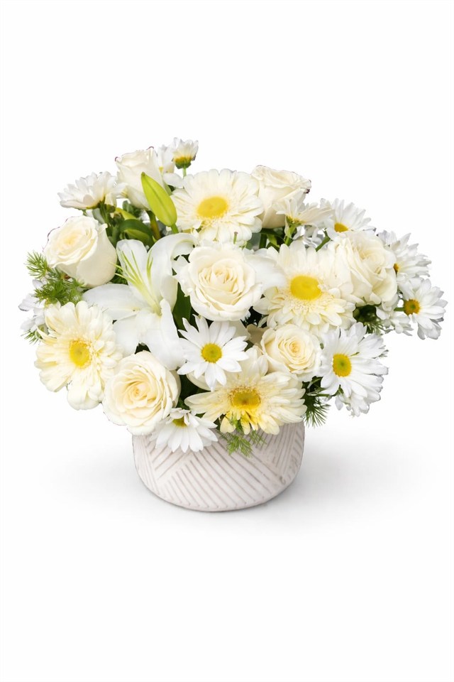 Beyazın asaleti ve doğallığını bir araya getiren bu özel tasarım; beyaz güller, belirgin papatyalar ve zarif lilyumlar ile özenle hazırlanmıştır.Papatyaların dolgun ve canlı yapısı aranjmana hacim kazandırırken, güller romantik bir dokunuş, lilyumlar ise zarif bir duruş sunar.Şık desenli seramik saksı içerisinde sunulan bu aranjman;doğum günü, geçmiş olsun, yeni iş tebriği, teşekkür, ev ziyareti ve özel anlar için güvenle tercih edilebilir.Sade ama etkileyici görünümü sayesinde hem ev hem ofis ortamlarında uzun süre şıklığını korur.Florenta Çiçekçilik kalitesiyle hazırlanan bu ürün, sipariş üzerine günlük taze çiçekler kullanılarak özenle tasarlanır. ?? ÇİÇEK İÇERİĞİBeyaz Gül 7 ADETBeya Gerbera 5 ADETBeyaz Papatya 10 ADET (belirgin ve yoğun)Beyaz Lilyum 5 ADET (açık & tomurcuk)CipsofilyaDekoratif yeşillikler?? BAKIM ÖNERİLERİDirekt güneş ışığından uzak, aydınlık ortamda bulundurunuzSeramik içindeki sünger hafif nemli tutulmalıdırAşırı sulamadan kaçınılmalıdırLilyumlar açtıkça polenleri nazikçe temizlenebilir