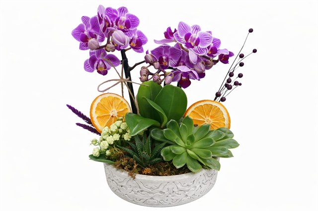 Doğanın en zarif çiçeklerinden biri olan mor mini orkide, bu özel tasarımda sukulentlerle birleşerek şık ve modern bir görünüm kazandı. Kuru portakal dilimleri ve doğal yosun dokusu ile zenginleştirilen bu aranjman, hem ev dekorasyonu hem de sevdiklerinize anlamlı bir hediye alternatifi olarak mükemmel bir seçimdir.Özel desenli beyaz seramik saksı içerisinde hazırlanan bu tasarım, bulunduğu ortama ferahlık ve canlılık katar. Özellikle doğum günü, yeni iş tebriği, teşekkür veya özel günlerde etkileyici bir hediye olarak tercih edilir.Florenta Çiçekçilik güvencesiyle özenle hazırlanır ve teslimata uygun şekilde paketlenerek gönderilir. ? Ürün İçeriği2 Dal Mor Mini Phalaenopsis OrkideSukulent Çeşitleri (Echeveria ve Aloe türleri)Doğal kuru portakal dilimleriDekoratif mor kuru başak süslemeDoğal yosun zeminDekoratif beton saksı ? Bakım BilgisiOrkideyi direkt güneş almayan aydınlık ortamda bulundurunuz.Sukulentler az su sever, haftada 1 kez az miktarda sulama yeterlidir.Aşırı sulama yapılmamalıdır.İç mekânda uzun süre sağlıklı şekilde yaşayabilir.