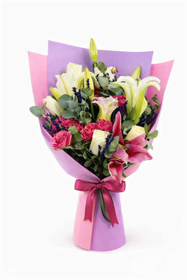 Sevdiklerinize unutulmaz bir sürpriz yapmak istiyorsanız bu buket tam size göre!Pembe lilyumların zarif duruşu, beyaz güllerin saflığı ve pembe güllerin romantik enerjisiyle hazırlanan bu özel tasarım; doğum günü, yıl dönümü, teşekkür veya “Seni Seviyorum” demenin en güzel yoludur.Mor-pembe ambalaj tasarımı ve pembe saten kurdelesiyle premium bir görünüm sunar. Okaliptus ve dekoratif yeşillikler bukete taze ve ferah bir hava katar.Florenta Çiçekçilik kalitesiyle aynı gün teslimat avantajı ile hazırlanır ve özenle paketlenerek gönderilir. ?? Ürün İçeriğiPembe Lilyum (1 dal)Beyaz Lilyum (1 dal)Beyaz Gül (3 adet)Pembe Çardak Gül (14 adet)OkaliptusLavanta / mor aksesuar çiçekler ?? Bakım ÖnerisiBuket suya konulmalı veya sap kısmı düzenli kesilmelidir.Serin ortamda muhafaza edilmelidir.Lilyumlar açıldıkça daha gösterişli hale gelir.Direkt güneş ve kalorifer yanından uzak tutulmalıdır ?? Kullanım Alanları ? Doğum günü? Sevgiliye sürpriz? Yıl dönümü? Yeni iş / terfi hediyesi? Geçmiş olsun? Özür & barışma buketi? Anneler günü / Kadınlar günü