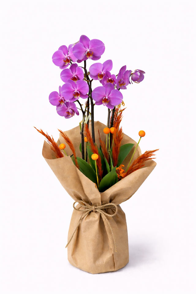 Mor Phalaenopsis orkide; asaleti, hayranlığı ve özel bağları simgeleyen rengiyle en etkileyici çiçek türlerinden biridir. Bu özel tasarımda orkidenin göz alıcı mor çiçekleri, doğallığı ön plana çıkaran kraft ambalaj ve sıcak tonlardaki dekoratif aksesuarlarla tamamlanmıştır.Canlı, sağlıklı ve çok dallı orkide; profesyonel floristler tarafından özenle hazırlanarak dengeli ve estetik bir form kazandırılmıştır. Doğal ip bağlama, kuru bitki dokunuşları ve canlı yeşil yapraklar tasarıma derinlik ve premium bir görünüm katar.Uzun ömürlü yapısı sayesinde haftalar boyunca tazeliğini korur ve bulunduğu ortama sofistike bir hava kazandırır. Doğum günü, yıl dönümü, teşekkür, yeni iş, terfi ya da özel günlerde klasik çiçeklerin ötesinde, fark yaratan bir hediye arayanlar için ideal bir seçimdir. ?? ÜRÜN İÇERİĞİMor Phalaenopsis Orkide (canlı – premium kalite)2 dal orkide (çiçek ve tomurcuklu)Doğal kraft ambalajDoğal ip bağlamaDekoratif kuru bitkiler & aksesuarlarCanlı yeşil yapraklar Dal ve çiçek sayısı orkidenin doğal yapısına göre değişiklik gösterebilir. ?? ORKİDE BAKIM TALİMATLARIAydınlık, direkt güneş almayan ortamHaftada 1 kez sulama (kökler kurudukça)Saksı tabağında su bırakılmamalıKlima ve kaloriferden uzak tutulmalı