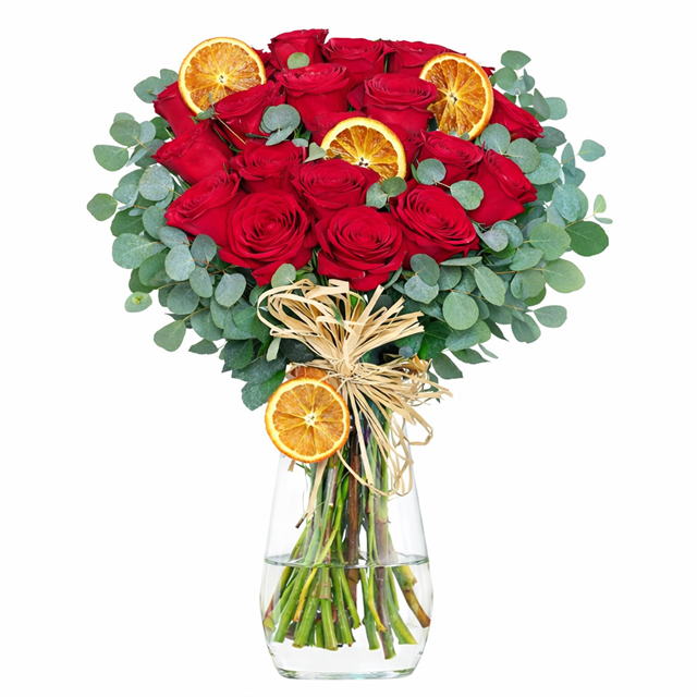 Florenta Çiçekçilik’in özel tasarım koleksiyonunda yer alan bu buket; romantik, doğal ve şık bir hediye arayanlar için hazırlanmıştır.Buket içerisinde kullanılan kırmızı güller, aşkın, tutkunun ve bağlılığın en güçlü sembolüdür. Aralara eklenen okaliptus yaprakları, bukete modern bir hava katarken aynı zamanda ferah bir görüntü sağlar. Tasarımın en özel dokunuşu olan kuru portakal dilimleri ise hem doğal hem de farklı bir görünüm sunarak buketi sıradan bir gül buketinden çıkarıp premium bir tasarıma dönüştürür.Cam vazoda hazırlanmış bu aranjman, hem hediye edildiği anda şık bir sunum sağlar hem de evde veya ofiste direkt kullanılabilir.Özel günlerde, romantik sürprizlerde ve anlamlı kutlamalarda en çok tercih edilen ürünlerden biridir. ?? Ürün İçeriği (Malzemeler) ? Kırmızı gül ( 20 adet premium kalite)? Okaliptus yaprakları (az yoğun – şık şekilde serpiştirilmiş)? Kuru portakal dilimleri (4 adet)? Cam vazo? Hasır rafya bağlama detayı ?? Çiçeklerin Anlamı ?? Kırmızı Gül: Aşk, tutku, bağlılık?? Okaliptus: Ferahlık, zarafet, modern görünüm?? Kuru Portakal: Doğallık, farklılık, premium tasarım hissiBu yüzden bu ürün, sadece çiçek değil; duyguyu gösteren bir hediye olur. ?? Bakım Önerileri Vazodaki su 2 günde bir değiştirilmelidir.Güllerin sapları 1-2 cm kesilerek suya konulmalıdır.Direkt güneş ışığından uzak tutulmalıdır.Serin ortamda daha uzun süre taze kalır. Florenta Çiçekçilik’te kullanılan güller günlük taze olarak seçilir. Ürün görseldeki tasarıma en yakın şekilde hazırlanır. Mevsimsel şartlara göre küçük farklılıklar olabilir ancak kalite ve şıklık korunur.