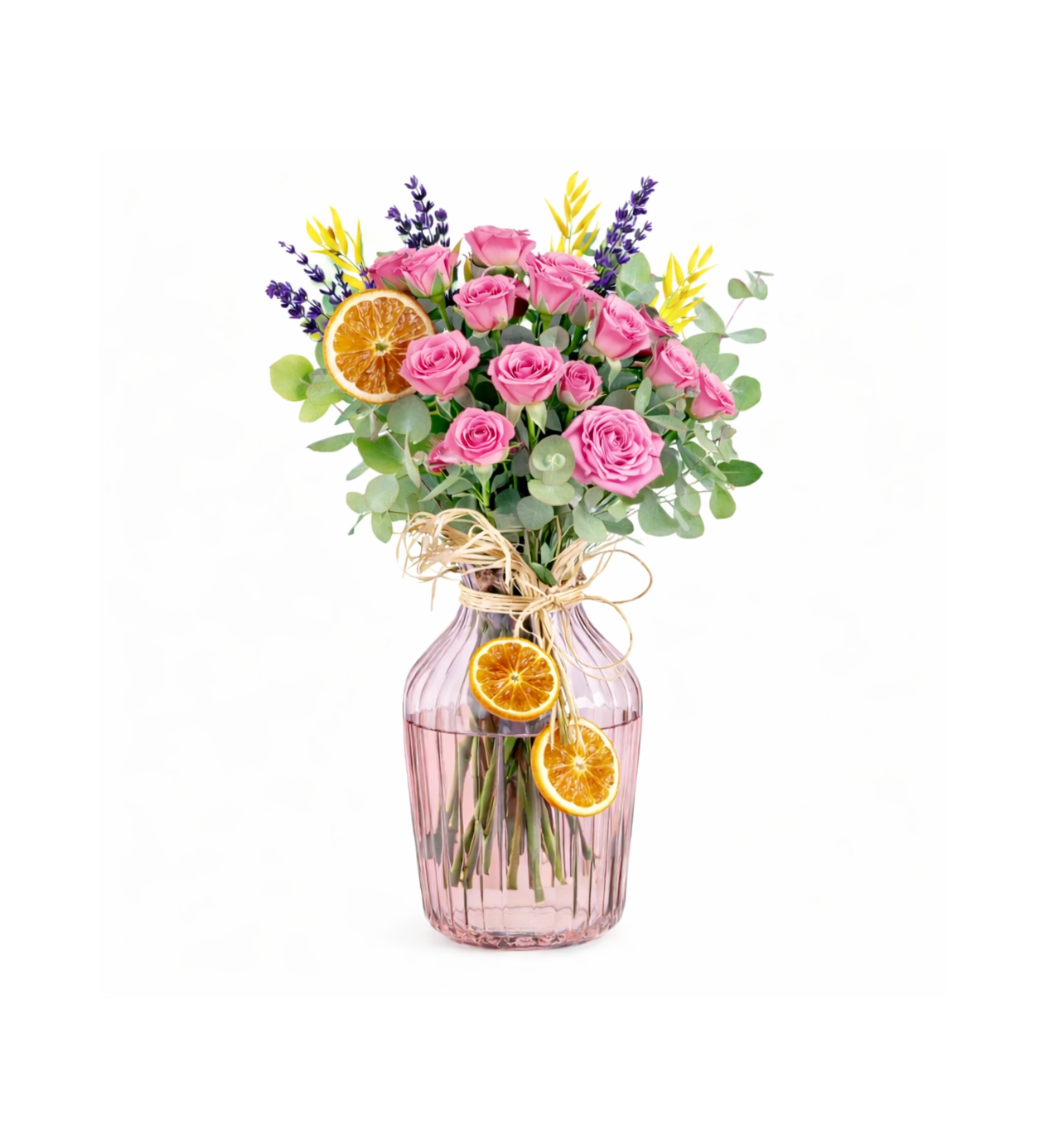 Canlı pembe güllerle hazırlanan bu özel aranjman, okaliptüs yapraklarıyla dengelenerek ferah ve zarif bir görünüm sunar. Kurutulmuş portakal dilimleri ve şeffaf cam vazo detayı, tasarıma doğal ve modern bir karakter kazandırır. Doğum günü, yıldönümü ve içten sürprizler için romantik ama sade bir hediye alternatifidir.?? Ürün İçeriğiPembe gül ( 35 adet )Okaliptüs ve mevsim yeşillikleriKurutulmuş portakal dilimleriŞeffaf cam vazo