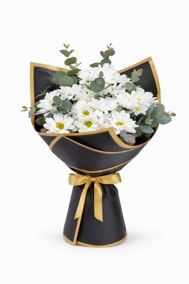 Sadeliğin en zarif hali…Siyah Gold Ambalajda Okaliptuslu Beyaz Papatya Buketi, beyaz papatyaların masumiyetini siyah ve gold detaylı lüks ambalajla buluşturan özel bir tasarımdır.Beyaz papatyalar, saflığın ve içten duyguların simgesi olarak her dönemde en çok tercih edilen çiçeklerden biridir. Okaliptus yaprakları ise bukete modern ve ferah bir hava katarak tasarımı daha prestijli bir seviyeye taşır. Siyah ambalajın gold detaylarla birleşmesi sayesinde ürün hem şık hem de premium bir görüntü sunar.Bu buket; doğum günü, teşekkür, geçmiş olsun, yeni iş tebriği, sevgiliye hediye ya da “seni düşünüyorum” demek istediğiniz her an için mükemmel bir seçimdir. Zarif görünümü sayesinde hem kadınlara hem erkeklere hediye edilebilecek en özel buketler arasındadır.Florenta Çiçekçilik kalitesiyle taze çiçekler kullanılarak hazırlanır, özenle paketlenir ve güvenle teslim edilir. ? Ürün İçeriği (Detaylı)Beyaz Papatya (Krizantem) 25-30 ADET Okaliptus yapraklarıSiyah premium buket ambalajı(Çiçek adedi mevsim ve stok durumuna göre farklılık gösterebilir, buket dolgunluğu korunur.)?? Beyaz Papatya Anlamı:Saf sevgi, masumiyet, içtenlik ve temiz duygular…?? Okaliptus Anlamı:Ferahlık, huzur, güçlü bağ ve yenilenme…Bu nedenle bu buket, “samimi ve gerçek” duyguları ifade etmek isteyenler için mükemmel bir tercihtir.? Hangi Durumlarda Tercih Edilir??? Doğum günü hediyesi?? Geçmiş olsun buketi?? Teşekkür çiçeği?? Yeni iş tebriği / ofis hediyesi?? Anneler günü hediyesi?? Sevgiliye sade ama şık buket?? Mezuniyet çiçeği?? “Özür dilerim” çiçeği ? Bakım Bilgisi (Detaylı)Buketi teslim aldıktan sonra sap kısmını 1-2 cm çapraz kesiniz.Temiz bir vazoya koyup serin ortamda muhafaza ediniz.Vazo suyunu 2 günde bir yenileyiniz.Direkt güneş ışığından ve sıcak ortamdan uzak tutunuz.Klima ve kalorifer karşısında bırakmayınız.Daha uzun ömür için yaprakların suya temas etmemesine dikkat ediniz.