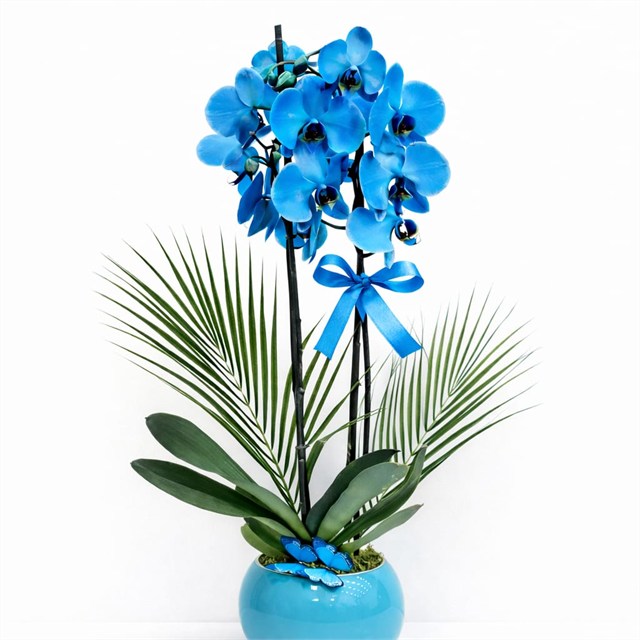 Şıklığın ve zarafetin en özel hali… Safir Mavi Orkide Tasarımı, göz alıcı mavi rengiyle bulunduğu ortamın havasını tamamen değiştirir. Çift dal orkide çiçeği, palmiye yapraklarıyla desteklenerek daha güçlü ve gösterişli bir görünüm kazanmıştır.Özel tasarım mavi saksı ve mavi kurdele detayıyla tamamlanan bu ürün, özellikle yeni iş tebriği, doğum günü, teşekkür hediyesi ve özel günlerde benzersiz bir tercih olur. Modern ve lüks duruşu sayesinde ev ve ofis dekorasyonuna da ayrı bir zarafet katar. ? Ürün İçeriği2 Dal Mavi Phalaenopsis OrkidePalmiye yaprağı dekoruMavi kurdele süslemeMavi akvaryum cam saksı ? Bakım BilgisiOrkideyi direkt güneş almayan aydınlık ortamda muhafaza ediniz.Haftada 1 kez az miktarda sulama yeterlidir.Fazla su kök çürümesine neden olabilir.Çiçekleri daha uzun süre korumak için klima ve kaloriferden uzak tutulmalıdır.Sulama sırasında yapraklara su değdirmemeye özen gösteriniz.
