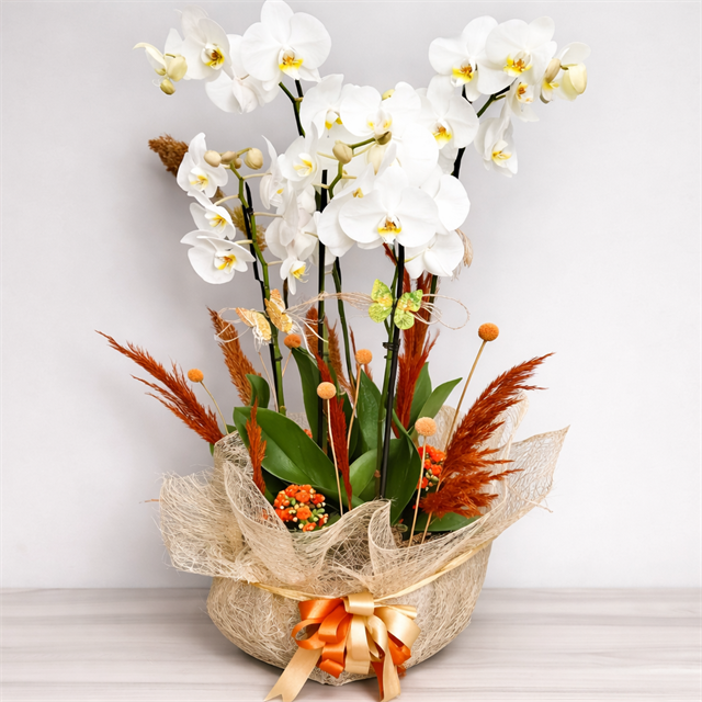 Beyaz Phalaenopsis orkide; saflığın, zarafetin ve iyi niyetin en güçlü temsilcilerinden biridir. Bu özel tasarımda, göz alıcı beyaz orkide dalları doğal hasır dokulu ambalaj, sıcak turuncu kurdele ve dekoratif kuru bitkilerle bir araya getirilerek hem modern hem de samimi bir görünüm elde edilmiştir.Canlı ve sağlıklı orkide dalları, tomurcuklu yapısıyla uzun süre tazeliğini korur. Yeşil yaprakların dolgun formu, turuncu tonlu aksesuarlarla dengelenerek tasarıma sıcaklık ve hareket kazandırır. Profesyonel floristler tarafından özenle hazırlanan bu aranjman, bulunduğu her ortamda ferah ve prestijli bir etki yaratır.Doğum günü, yeni iş, terfi, teşekkür ya da ev–ofis dekorasyonu için sade ama etkileyici bir hediye arayanlar için mükemmel bir tercihtir. Uzun ömürlü yapısı sayesinde haftalar boyunca ilk günkü şıklığını korur. ?? ÜRÜN İÇERİĞİBeyaz Phalaenopsis Orkide (canlı – premium kalite)2–3 dal orkide (çiçekli ve tomurcuklu)Doğal hasır ambalajTuruncu & altın tonlu kurdeleDekoratif kuru bitkiler ve aksesuarlarCanlı yeşil yapraklar Dal sayısı ve tomurcuk yoğunluğu mevsime göre değişiklik gösterebilir. ?? ORKİDE BAKIM TALİMATLARIAydınlık fakat direkt güneş almayan ortamHaftada 1 kez sulama (kökler kurudukça)Saksı altında su biriktirilmemeliKlima ve kaloriferden uzak tutulmalı
