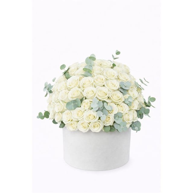 Tamamı beyaz güllerden oluşan bu özel aranjman, modern çizgilere sahip silindir kutu içerisinde yoğun ve simetrik bir formda hazırlanmıştır. Her bir gül, tazeliği ve renk bütünlüğü korunarak özenle seçilmiş; aranjmana eşlik eden okaliptus yaprakları ile doğal ve ferah bir görünüm kazandırılmıştır.Beyaz güllerin sade ama güçlü etkisi, bu tasarımda asil bir duruşla buluşur. Gösterişten uzak, zamansız ve şık bir görünüm sunan bu gül kutusu; bulunduğu ortama zarafet katar ve duyguların en saf hâlini yansıtır.Özel günlerde, anlamlı kutlamalarda veya içten bir jest yapmak istediğiniz her an tercih edebileceğiniz bu premium aranjman; uzun süre tazeliğini koruyan canlı güllerle hazırlanır. Minimal tasarımı sevenler ve klasik şıklığı tercih edenler için ideal bir seçimdir. ?? ÜRÜN DETAYLARIÇiçek Türü: Lila (lavanta ton) gülGül Sayısı: 100 adetYeşillik: OkaliptusKutu: Lila silindir kutuTasarım: Full dolu, kubbe formStil: Premium – zarif – modern