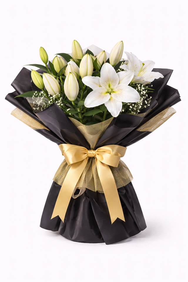 Beyaz lilyumların asil duruşu, tomurcuklu yapısıyla uzun ömürlü bir görsellik sunar.Henüz açmamış lilyum tomurcukları zamanla çiçeğe dönüşerek buketin günler boyunca tazeliğini ve estetiğini korumasını sağlar.Siyah ambalaj ve altın kurdele detayı, bu tasarıma lüks ve premium bir karakter kazandırır.Özel günler, tebrik, teşekkür, yeni iş kutlaması veya sade ama etkileyici bir sürpriz için en çok tercih edilen lilyum buketlerinden biridir.Florenta Çiçekçilik kalitesiyle özenle hazırlanır, aynı gün teslimatla güvenle gönderilir.ADET : 6 DAL BEYAZ LİLYUM