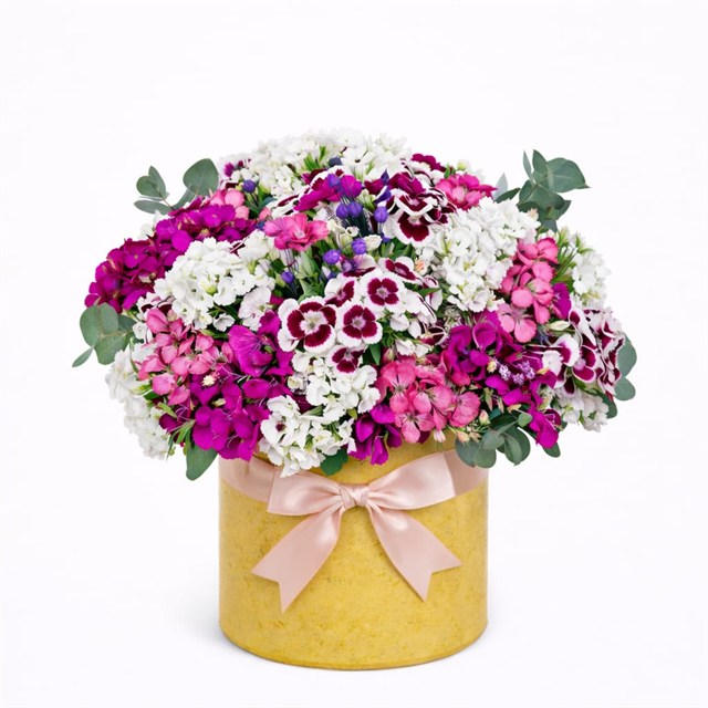 Mor, fuşya, pembe ve beyaz tonların göz alıcı uyumuyla hazırlanan bu özel aranjman; yoğun Hüsnüyusuf (Dianthus) çiçekleriyle dolgun ve premium bir görünüm sunar.Canlı renk geçişleri sayesinde enerjik, neşeli ve dikkat çekici bir etki yaratır.Şık silindir kutu içerisinde, saten kurdele detayıyla tamamlanan bu tasarım;doğum günü, teşekkür, yeni iş tebriği, geçmiş olsun ve özel günler için ideal bir tercihtir.Hem modern hem de sıcak tarzı sayesinde her ortamda fark yaratır.Florenta Çiçekçilik kalitesiyle, siparişe özel – günlük taze çiçekler kullanılarak hazırlanır. ?? ÇİÇEK İÇERİĞİRenkli Hüsnüyusuf (Dianthus)MorFuşyaPembeBeyazDekoratif yeşillikler (okaliptüs vb.) ?? BAKIM ÖNERİLERİSünger hafif nemli tutulmalıdırDirekt güneş ve cereyandan uzak konumlandırılmalıdırAşırı sulamadan kaçınılmalıdırSerin ortamda daha uzun süre canlı kalır