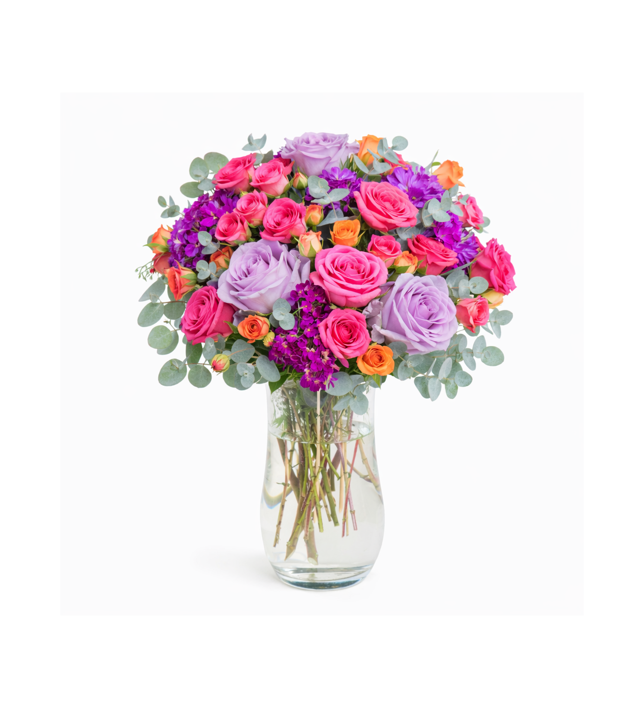 Cam vazo içerisinde hazırlanan bu özel aranjman; pembe, lila ve turuncu güllerin uyumunu mor dolgu çiçekleri ve okaliptüs yapraklarıyla tamamlar. Renkli ve dolgun yapısı sayesinde bulunduğu ortama anında enerji ve mutluluk katar.Farklı renklerin bir arada kullanılması; neşe, sevgi ve pozitifliği simgeler.Doğum günü, kutlama, teşekkür ya da özel anlarda tek başına “wow” etkisi yaratan bir hediyedir.Tüm ürünler günlük taze çiçeklerle hazırlanır.?? ÜRÜN DETAYLARIÇiçek Türü: Karışık renk gül (pembe, lila, turuncu)3 lila gül 15 pembe çardak gül 15 turuncu çardak gül 6 dal hüsnüyusuf