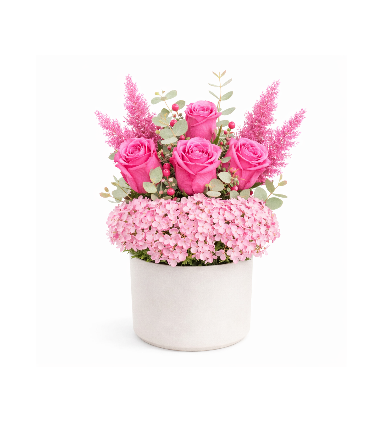 Beyaz seramik saksı içerisinde hazırlanan bu özel tasarım; pembe güllerin romantik zarafetini, pembe hüsnüyusuf dolgunluğu ve astilbenin zarif dokusuyla bir araya getirir. Okaliptüs yaprakları sayesinde ferah ve modern bir görünüm kazanır.Pembe tonlar; sevgi, şefkat ve içten duyguları simgeler.Doğum günü, yıldönümü, teşekkür veya “seni düşünüyorum” demek için çok güçlü ve şık bir tercihtir.Tüm aranjmanlar günlük taze çiçeklerle hazırlanır.?? ÜRÜN DETAYLARIÇiçek Türü: Pembe hüsnüyusuf 1 demetGül Adedi: 4 adetSaksı: Beyaz seramik