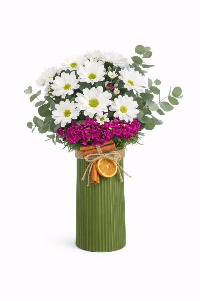 Tarçın Esintisi aranjmanı; beyaz papatyaların saflığını, mor çiçeklerin zarafetini ve yeşil seramiğin modern duruşunu bir araya getiren özel bir tasarımdır.Doğal okaliptüs yaprakları, tarçın çubukları ve kurutulmuş portakal detayıyla zenginleştirilen bu aranjman hem dekoratif hem de anlam yüklü bir hediye alternatifidir.Minimal ve şık yapısı sayesinde ev, ofis ve iş ortamlarında ferah bir atmosfer oluşturur. Uzun ömürlü çiçek yapısı ile kalıcı bir mutluluk sunar. ?? ÜRÜN İÇERİĞİBeyaz Papatya 15 adetHüsnüyusuf çiçekleri 5 dalOkaliptüs yapraklarıTarçın çubukları 2 adetKurutulmuş portakal dilimi 1 adet ?? ÜRÜN BOYUTLARIYaklaşık Yükseklik: 35 – 40 cmVazo Çapı: 10 – 12 cm