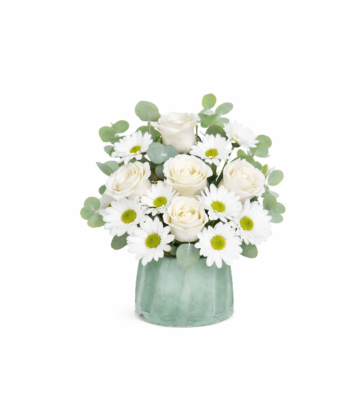 Turkuaz vazo içerisinde hazırlanan bu şık aranjman; beyaz güllerin asil duruşunu beyaz papatyaların neşesi ve okaliptüsün ferahlığıyla tamamlar. Sade ve modern tasarımıyla her ortama uyum sağlar.Beyaz tonlar; saflığı, saygıyı ve huzuru simgeler. Yeni iş tebriği, geçmiş olsun, teşekkür ya da ev–ofis dekorasyonu için ideal bir tercihtir. Günlük taze çiçeklerle hazırlanır.?? ÜRÜN DETAYLARIÇiçek Türü: Beyaz Papatya 15 adetGül Adedi: 5 adetVazo: Turkuaz seramik