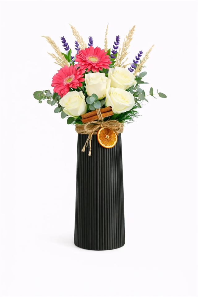 Doğallığın sıcaklığı ile zarafetin kusursuz uyumunu bir araya getiren Tarçın & Portakal Esintisi – Beyaz Güllü Premium Aranjman, özel tasarımı ve güçlü görsel etkisiyle bulunduğu her ortama şıklık katar. Beyaz güllerin saf ve asil duruşu, gerberaların enerjik dokunuşu ve lavantanın huzur veren aromatik etkisiyle bu aranjman; klasik çiçeklerden sıkılanlar için fark yaratan bir alternatiftir. Özenle seçilmiş 4 adet taze beyaz gül, aranjmanın merkezinde yer alarak saflığı ve zarafeti simgeler. Güllere eşlik eden canlı renkli gerberalar, tasarıma dinamizm kazandırırken; oktaliptüs yaprakları ve doğal yeşillikler modern bir görünüm sunar. Başaklar arasına dengeli şekilde yerleştirilen lavanta dalları, hem görsel derinlik hem de doğal bir karakter kazandırır. Aranjmanın doğal ruhunu güçlendiren kuru portakal dilimi ve tarçın çubuğu, rustik bir estetik sunarken ürünü benzersiz kılar. Tüm bu detaylar, hasır ip bağlama ile tamamlanarak el yapımı hissi güçlendirilmiştir. Tasarım, modern çizgilere sahip siyah silindir vazo içerisinde sunularak premium bir duruş elde edilmiştir. ?? ÜRÜN İÇERİĞİ (DETAYLI)4 adet Beyaz Gül (taze kesim, ithal kalite)2 adet Gerbera (canlı renkli, merkezde vurgu)Lavanta dalları (başak aralarına dengeli şekilde dağıtılmış)Okaliptüs yapraklarıDekoratif kuru başaklar1 adet kuru portakal dilimi1 adet tarçın çubuğu (gül yanında, doğal görünüm)?? BAKIM TALİMATLARIVazodaki su 2 günde bir yenilenmelidirDirekt güneş ışığından uzak tutulmalıdırSerin ve havadar ortamda daha uzun ömürlü olurGüllerin sap uçları 1–2 cm çapraz kesilirse canlılığı artar