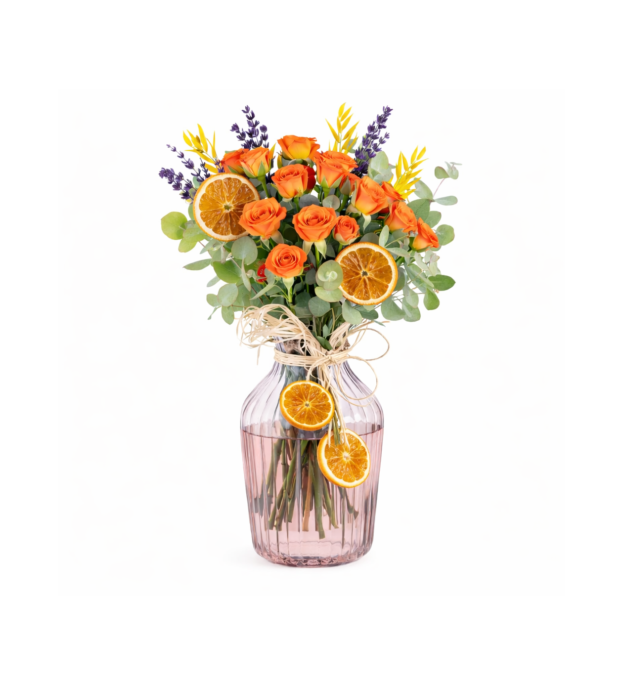 Özel pembe cam vazo içerisinde hazırlanan bu aranjman, pembe güllerin romantik zarafetini okaliptüs, lavanta ve dekoratif portakal dilimleriyle bir araya getirir.Doğal rafya bağlama detayı sayesinde butik ve el yapımı bir görünüm sunar.Hem enerjik hem romantik havasıyla doğum günü, teşekkür, yeni iş tebriği veya özel günler için farklı ve akılda kalıcı bir hediye alternatifidir.Günlük taze çiçeklerle hazırlanır.?? ÜRÜN DETAYLARIÇiçek Türü: Pembe Çardak GülGül Adedi: 18 adet