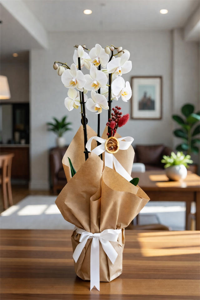 Beyaz Phalaenopsis orkidenin zarif çiçekleri, doğallığı ön plana çıkaran kraft ambalaj ile modern ve sıcak bir tasarıma dönüşüyor. Minimal çizgilerle hazırlanan bu özel aranjman; hem klasik hem de çağdaş zevklere hitap eden güçlü bir estetik sunar.Canlı, sağlıklı ve çok dallı orkide; profesyonel floristler tarafından dengeli ve simetrik bir formda hazırlanmıştır. Kraft sargı, beyaz kurdele ve doğal aksesuar dokunuşlarıyla tasarım zenginleştirilmiş; sade ama etkileyici bir görünüm elde edilmiştir.Uzun ömürlü yapısı sayesinde haftalar boyunca tazeliğini korur ve bulunduğu ortama ferahlık katar. Doğum günü, yeni iş, terfi, teşekkür, geçmiş olsun ya da ev–ofis dekorasyonu için güvenle tercih edilebilecek prestijli bir çiçektir. Abartıdan uzak ama mesajı güçlü bir hediye arayanlar için ideal seçimdir. ?? ÜRÜN İÇERİĞİBeyaz Phalaenopsis Orkide (3 DAL)Doğal kraft ambalajBeyaz saten kurdeleDekoratif doğal aksesuarlar (kuru bitki / doğal detay)Canlı yeşil yapraklar Dal ve çiçek sayısı orkidenin doğal yapısına göre değişiklik gösterebilir. ?? ORKİDE BAKIM TALİMATLARIAydınlık fakat direkt güneş almayan ortamHaftada 1 kez, kökler kurudukça sulamaSaksı tabağında su biriktirilmemeliKlima, kalorifer ve cereyandan uzak tutulmalı